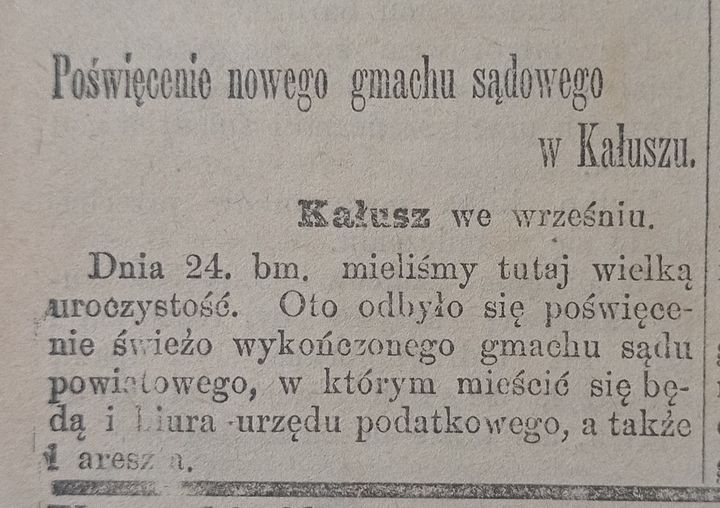 Можна б засумніватися в такому твердженні. Але не варто. Чудовий доказ цього надав Володимир Семенів, коли віднайшов у часописі "Wiek nowy" за 1 жовтня 1901 року допис про посвячення нової будівлі повітового суду. Це будівля на вул. Бандери, в якій зараз працює дитяча музична школа, йдеться на Facebook-сторінці "Old Kalush", інформують "Вікна".