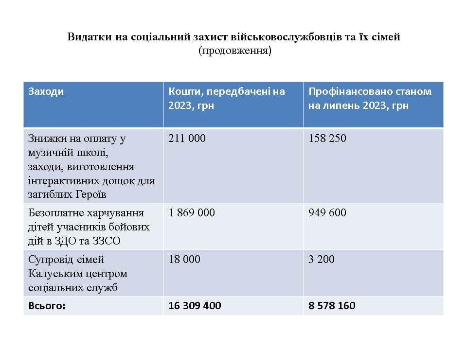 Профінансовано оздоровлення та відпочинок дітей військовослужбовців, безоплатне відвідування басейну «Посейдон», 50-відсоткова знижка плати за навчання у Калуській музичній школі на 549 900 гривень.