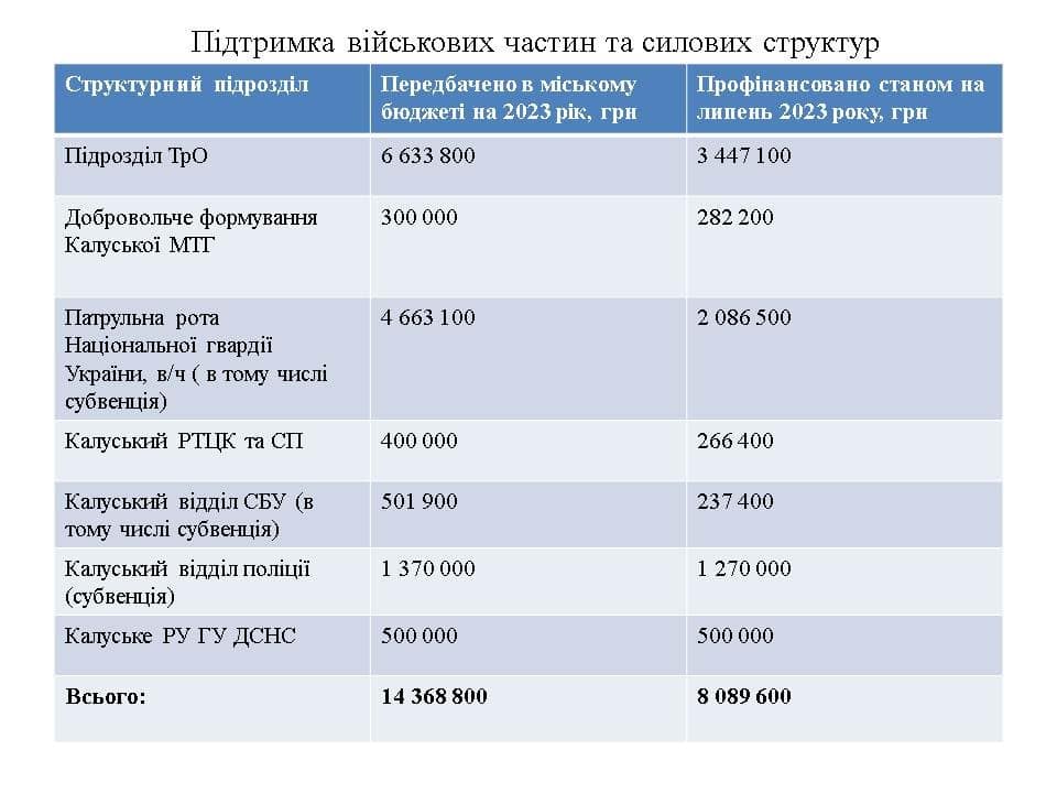 З використаних коштів близько 3,5 млн гривень спрямували на підрозділ територіальної оборони. Ще понад 4,6 млн гривень у 2023 році станом на липень використали на підтримку військових і силових підрозділів, які дислокуються у Калуші.