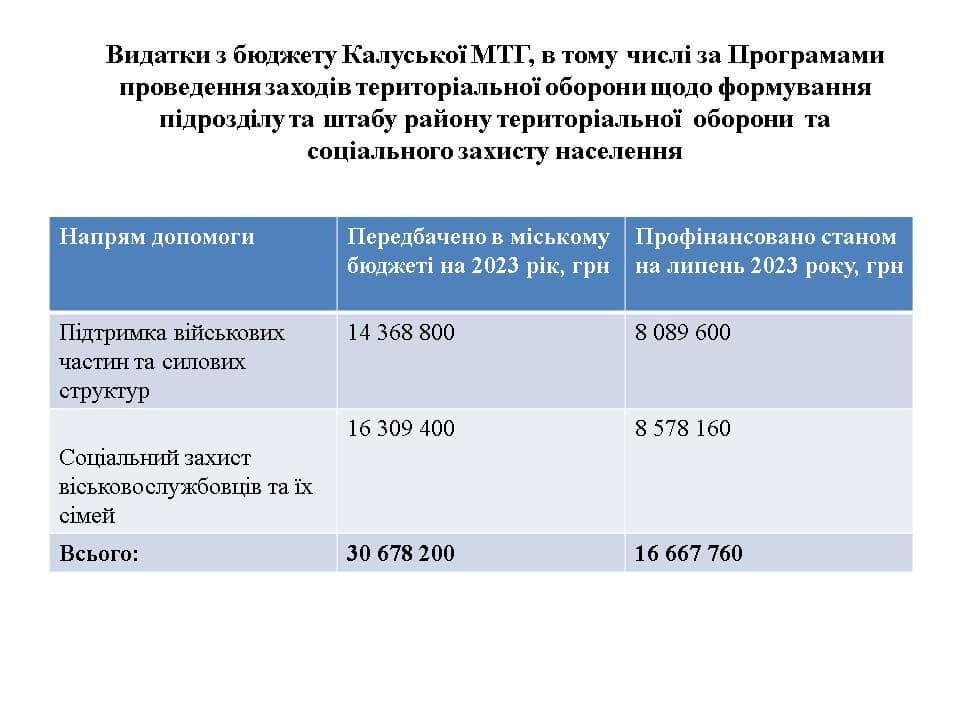 Додамо, як випливає з бюджетних звітів, які оприлюднені на сайті міської ради, у 2022 році програма проведення заходів територіальної оборони, формування підрозділу та штабу району територіальної оборони була профінансована з бюджету Калуської громади на суму близько 3,3 млн гривень, а за перше півріччя поточного року (станом на кінець червня) — на 2 млн 760 тис. гривень.
