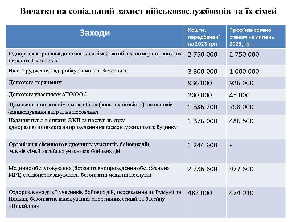 Зокрема, 14 368 800 гривень передбачено на підтримку військових частини та силових структур і 16 309 400 гривень — на соціальний захист військовослужбовців та їхніх сімей. Станом на липень профінансовано загалом 16 667 760 гривень.