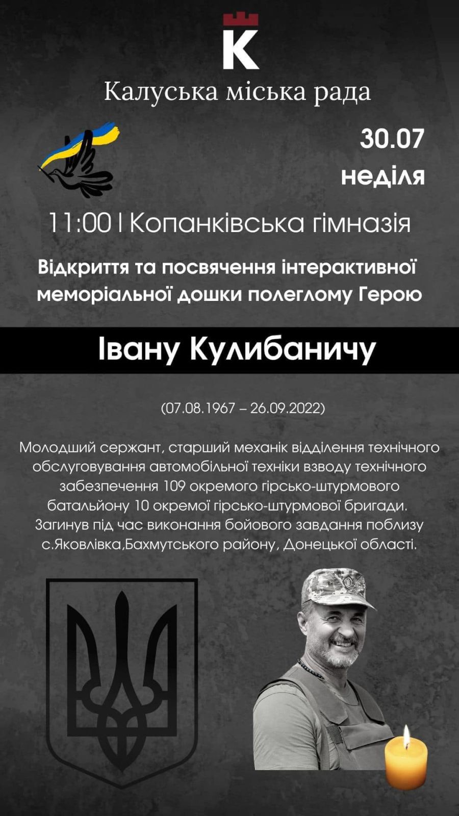 Іван Кулибанич (07.08.1967 — 26.09.2022) — Захисник України, який загинув в запеклому бою з ворогом. Молодий сержант, старший механік відділення технічного обслуговування автомобільної техніки взводу технічного забезпечення 109 окремої гірсько-штурмової бригади, інформують "Вікна".