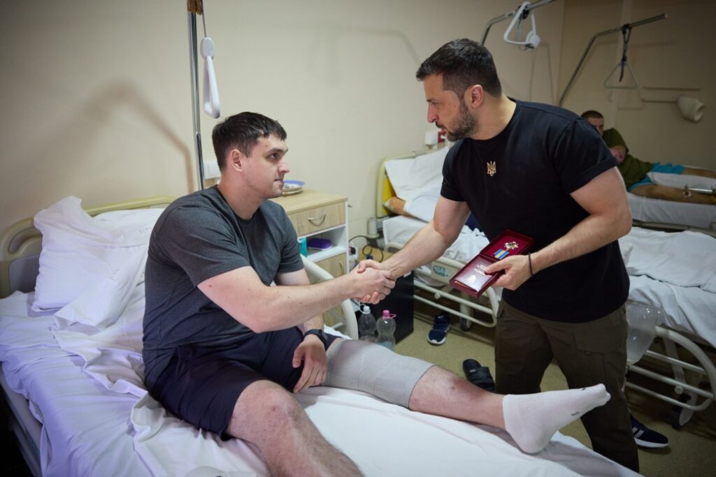 Володимир Зеленський поспілкувався із захисниками, які перебувають на лікуванні, поцікавився станом їхнього здоров’я й побажав швидкого одужання. Президент вручив військовослужбовцям державні нагороди – ордени «За мужність» IIІ ступеня.