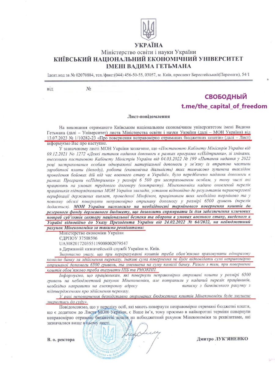 Так, заклади освіти отримали лист про необхідність повернення співробітниками бюджетних коштів, виплачених їм навесні 2022 року в межах програми "єПідтримка".