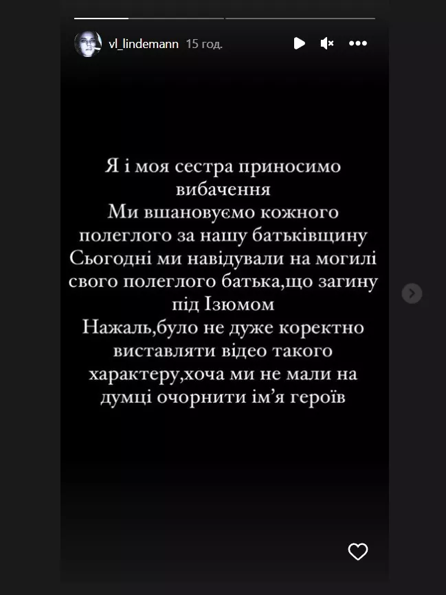 Згодом сестри опублікували на своїй сторінці Instagram дописи, де перепросили за танці поблизу могил. Вони зазначили, що відвідували свого батька, який загинув під Ізюмом на Харківщині.