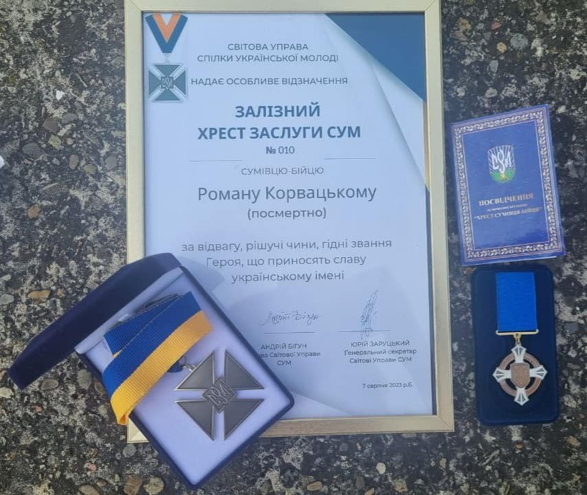 Особливим відзначенням Спілки Української Молоді за геройський Чин "Залізний Хрест Заслуги" посмертно нагороджено члена Калуського осередку СУМ в Україні Романа Корвацького. Друг Роман загинув 2 серпня 2023 року, виконуючи в лавах Збройних Силу України свій військовий обов'язок захисту Вітчизни.
