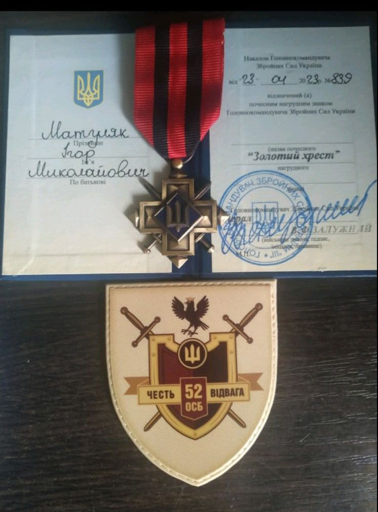 Військовий Ігор Матуляк отримав нагрудний знак "Золотий хрест" від Головнокомандувача Збройних сил України Валерія Залужного, інформують "Вікна".