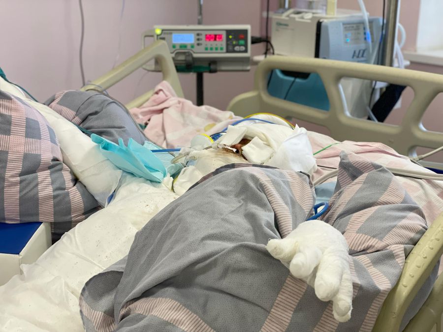 Пацієнт поступив із опіками дихальних шляхів та тіла. Вогонь вразив 45-50% шкірних покривів, з яких 20% — глибокі рани. Чоловікові провели операцію — змертвілі внаслідок опіку тканини видалили і частково одномоментно закрили власною шкірою пацієнта.
