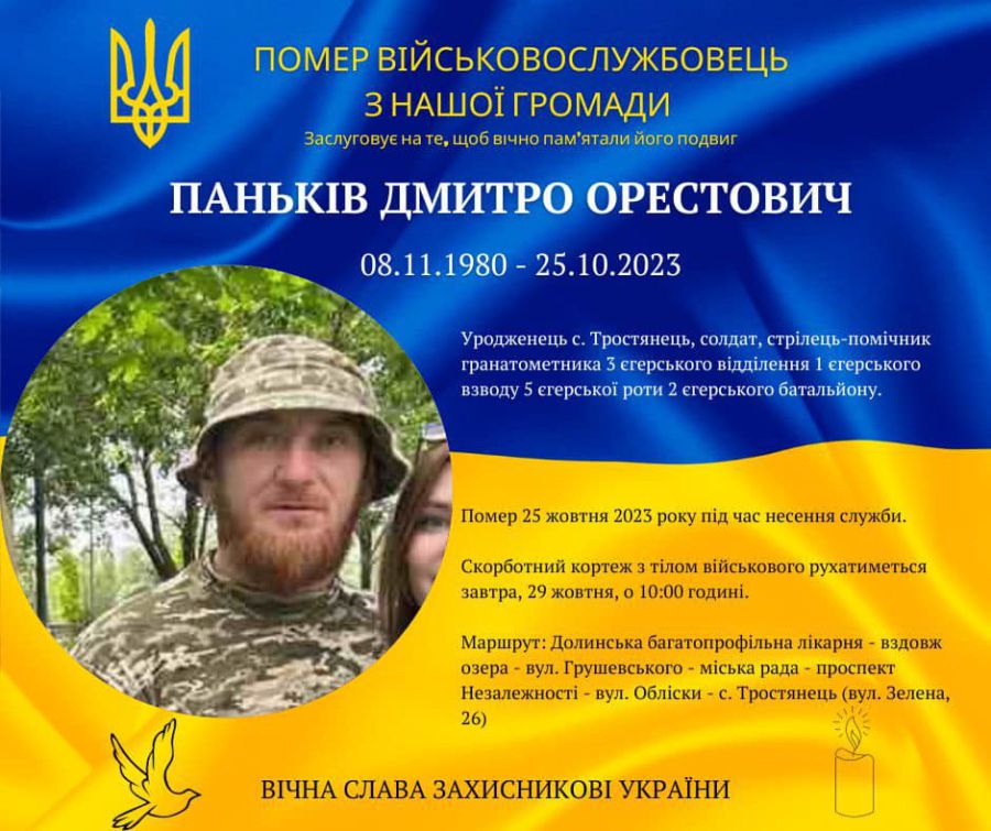 «З сумом повідомляємо про ще одну втрату .Помер військовослужбовець з нашої громади ПАНЬКІВ Дмитро Орестович. Чоловік мужньо захищав країну, боровся із ворогом на фронті, проте підступна хвороба забрала його життя…Дякуємо, воїне, за подвиг, за службу та захист. Співчуття рідним і близьким…» — ідеться в повідомленні