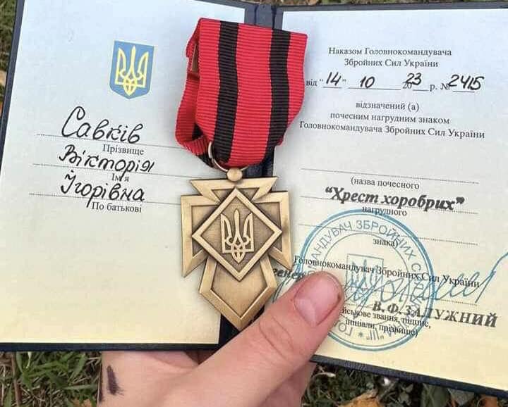 Довідка. Нагрудним знаком «Хрест хоробрих» нагороджуються військовослужбовці та працівники Збройних Сил України за героїчний вчинок, пов'язаний з ризиком для життя (здоров'я) під час участі у бойових діях об'єднаних, антитерористичних операцій, а також операціях з підтримання миру та безпеки, ліквідації наслідків природних та техногенних катастроф, інших надзвичайних ситуацій.