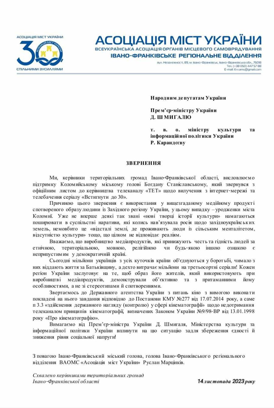 Керівники територіальних громад Івано-Франківської області звернулися до народних депутатів України, прем’єр-міністра Дениса Шмигаля, т. в. о. міністра культури та інформаційної політики Ростислава Карандєєва. Причиною цього звернення є використання у серіалі "Встигнути до 30" спотвореного образу людини із Західного регіону України, у цьому випадку — уроджениці міста Коломия, йдеться на фейсбук-сторінці "Децентралізаційний марафон", інформують "Вікна".