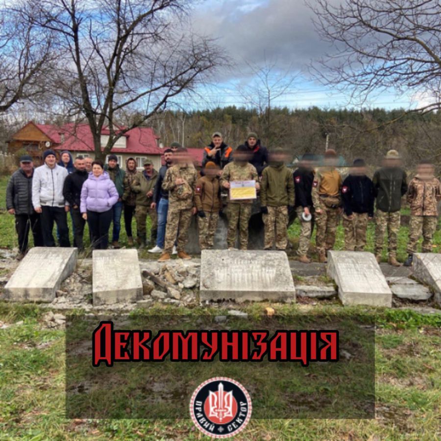 "Представники Правого Сектору Прикарпаття разом із свідомими та активними громадянами в селі Текуча декомунізували пам'ятник радянському окупанту. Геть радянські пам’ятники з України! На нашій українській землі не має залишитись нічого, що возвеличує рядянських окупантів", — йдеться у повідомленні.