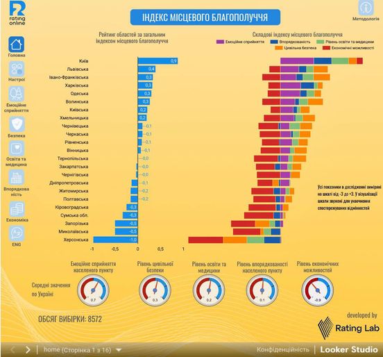 Отримані дані базуються на результатах опитування майже 9000 респондентів в 22-х областях та м. Києві, які давали оцінки власним містам і селам за 22-ма показниками, що згодом виокремили у 5 складових.