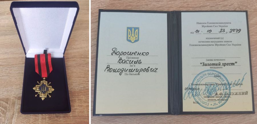Нагороду воїну присвоєно за проявлену мужність, заслуги, сумлінне виконання поставлених завдань під час відсічі ворогу на полі бою. Відзнаку матері Героя Олександрі Дорошенко вручив староста села Тязів Василь Боднарчук, інформують "Вікна" з посиланням на сайт Ямницької громади.