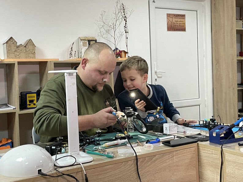 "Намагаюся йому прищеплювати любов до техніки. Сьогодні пробуємо дрони паяти, надіємося, любов "прилипне", — каже Сергій Савіцький.