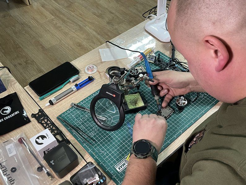 Після збору FPV-дрони налаштовують та тестують. Зокрема, на місці волонтери перевіряють двигуни та чи правильно спаяли деталі.