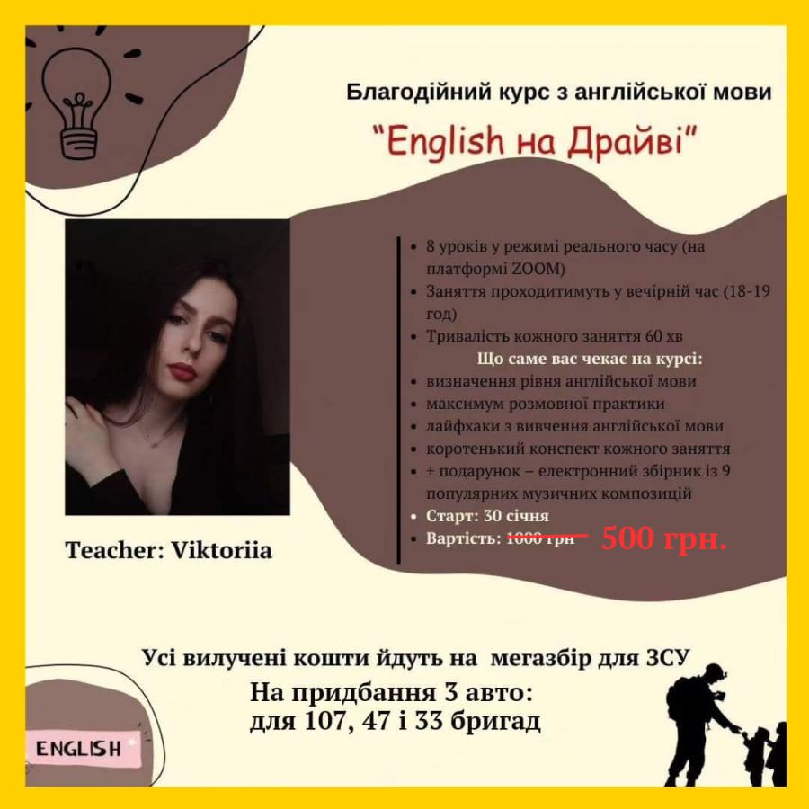 "Еnglish на драйві" — це благодійна ініціатива дипломованої викладачки Вікторії Шевчук, яка хоче підтримати мегазбір.