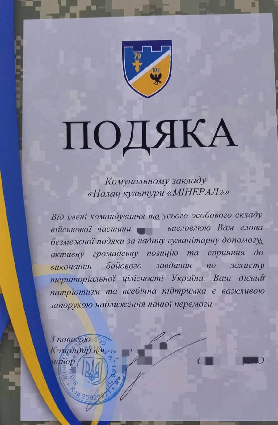 Колектив палацу культури "Мінерал" отримав подяку за сприяння ЗСУ від одного із бойових підрозділів.