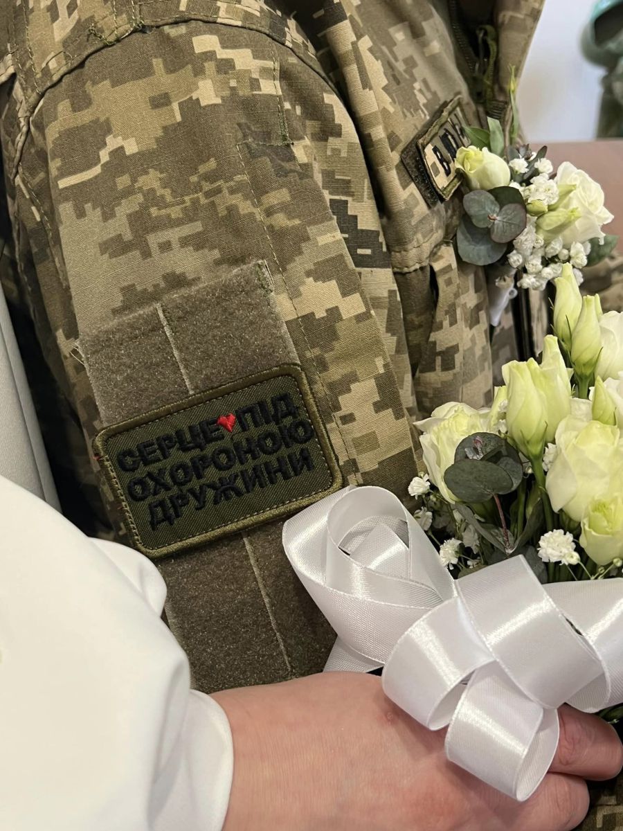 Серед молодят — була і сімейна пара з військовим-захисником України, який віддав серце дружині. Саме так зазначено на його шевроні, інформують "Вікна".