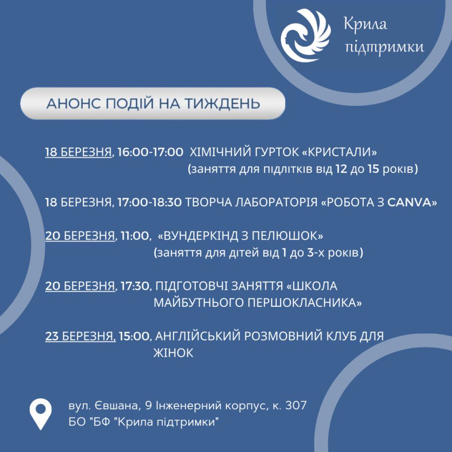 - 15:00-16.00 — "Англійський розмовний клуб для жінок". Реєстрація на події за посиланням.