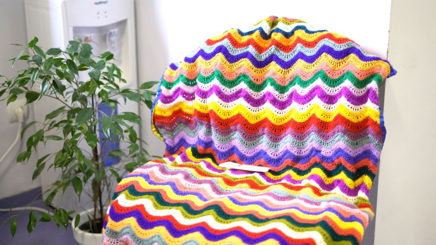 За словами Любові Теодорівни, дорогою з Маріуполя вдалося зв'язати три таких пледи. Також пенсіонерка вишиває з бісеру та складає алмазну мозаїку. Війну жінка пригадує з жахом та болем.