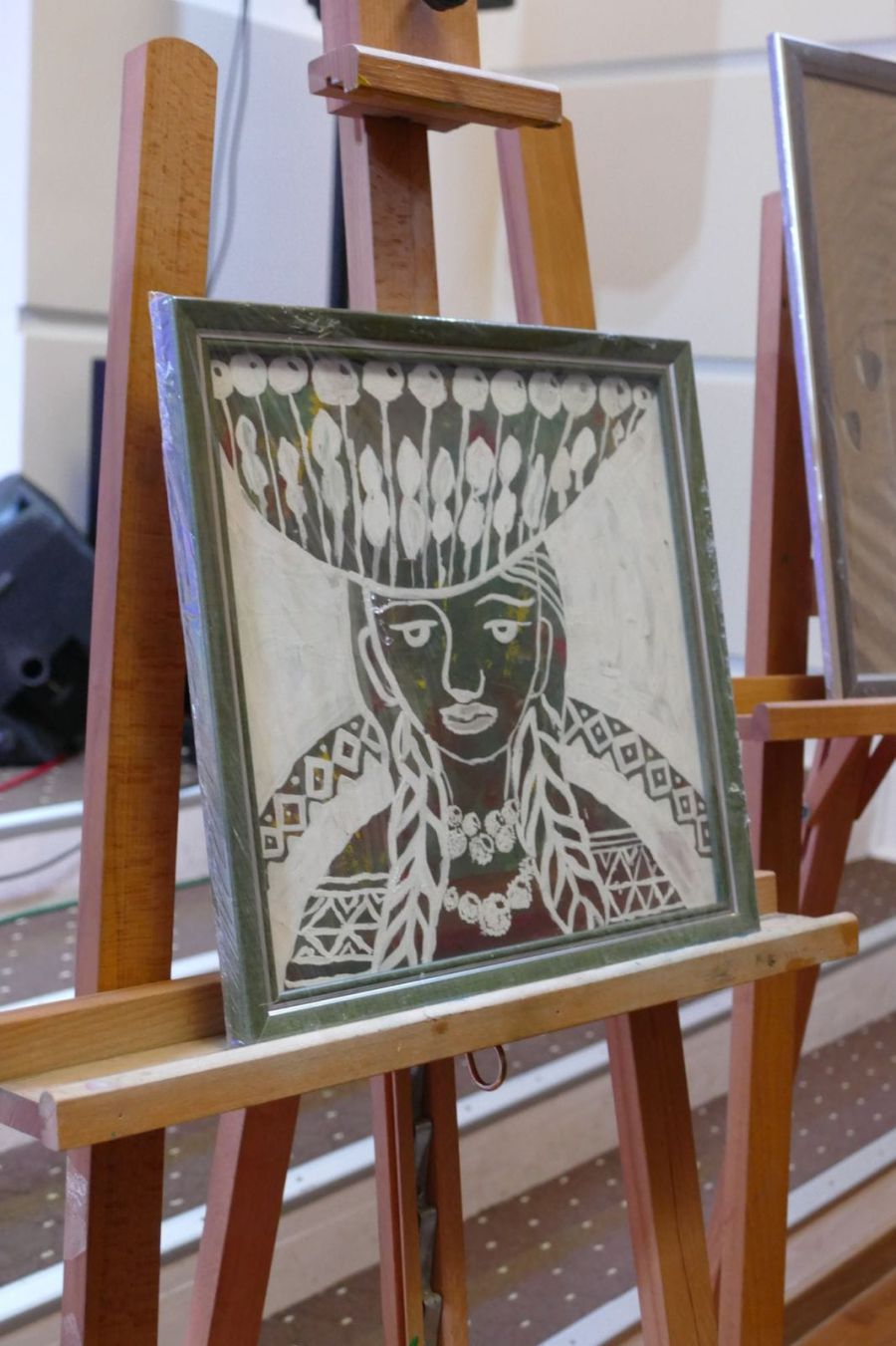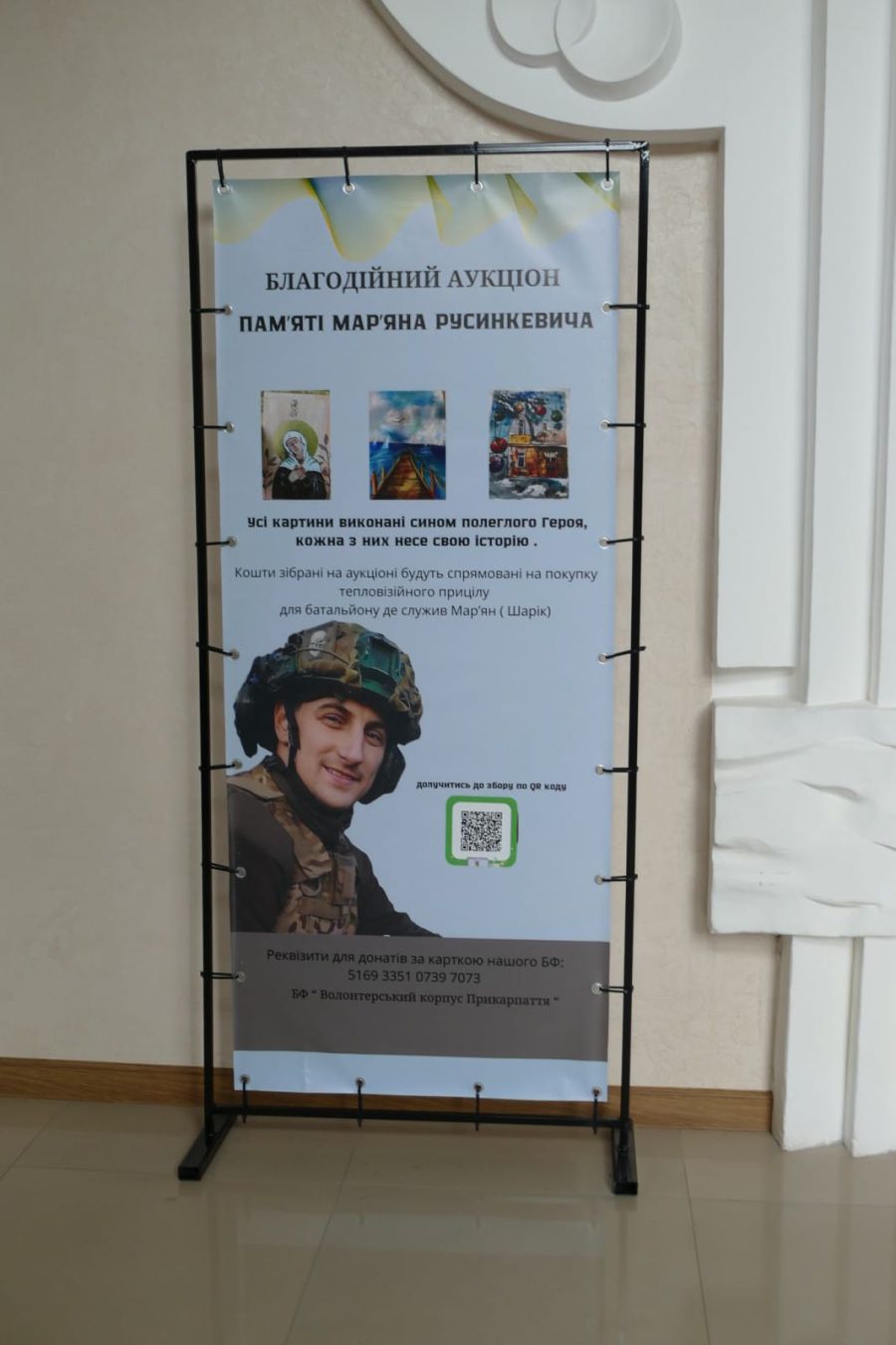 Крім того, на аукціон виставили картини, вишиті бісером, розписані тубуси, колекцію шевронів. На одному із тубусів зображено три постаті Героїв. Це — сам Мар'ян Русинкевич, і два Його побратими, з якими разом воював і загинув.