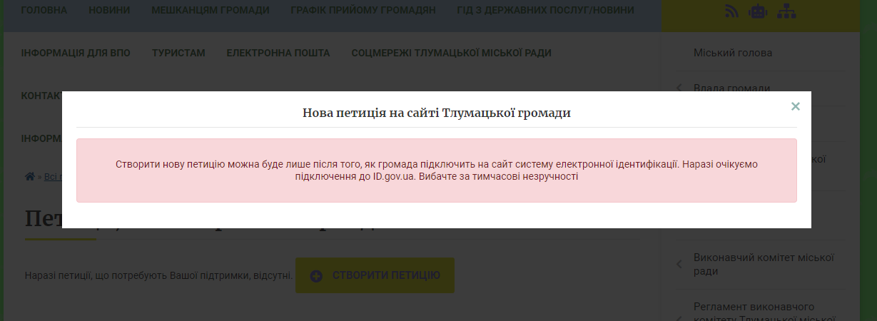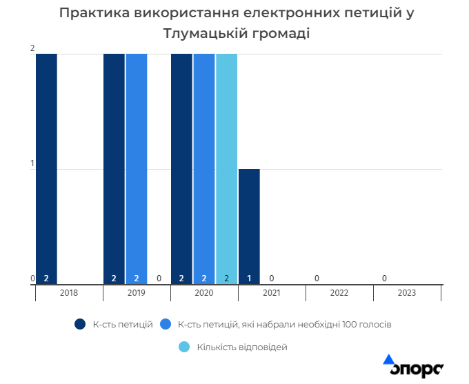 - Оскільки мешканці Тлумацької громади певний час активно використовували інструмент електронних петицій для впливу на прийняття рішень у громаді, слід якнайшвидше відновити можливість їх подання. Якщо зараз можливості повністю відновити роботу цього інструмента немає, варто звернутися до сервісу Єдиної системи місцевих петицій, який може допомогти надати готове технічне рішення.