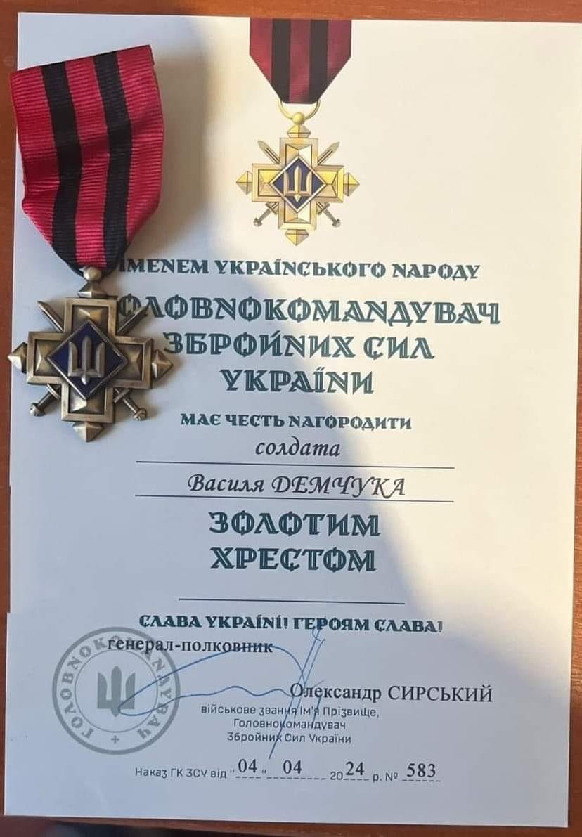 "Солдат Василь Демчук зарекомендував себе з позитивної сторони, та був представлений до цієї високої нагороди, яку отримав днями. Дякуємо нашому Захиснику за те, що щодня мужньо боронить нас, щодня ризикуючи життям", — йдеться в повідомленні Городенківської міької ради.