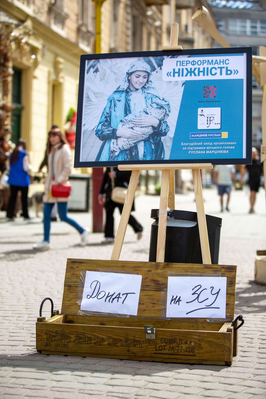В центрі Івано-Франківська відбувся перформанс живих скульптур «Ніжність». Глядачі могли побачити образи Діви Марії, матері з картини Марії Приймаченко, сучасної матері та військової. Поруч була встановлена скринька для донатів захисникам.