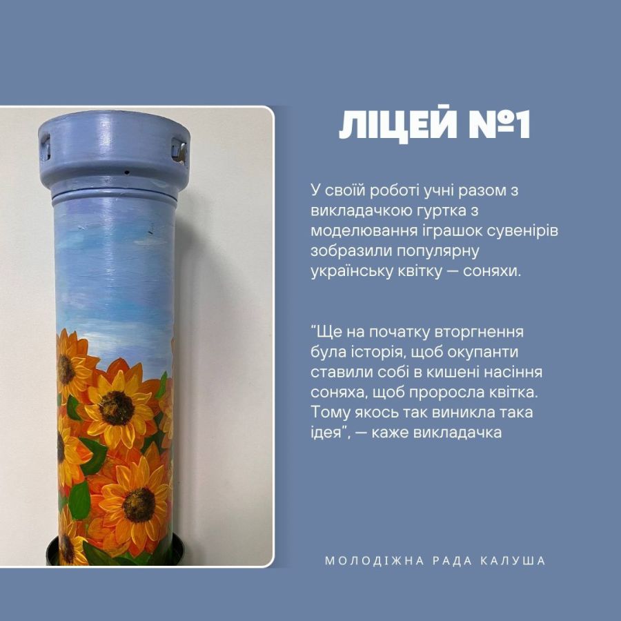 На початку проведення благодійної акції "Мистецтво заради Перемоги" учнів Калуського ліцею №1 попросили розмалювати один з тубусів на розіграш. В результаті вони на ньому зобразили жовті соняхи та мирне небо, інформують "Вікна" з посиланням на Молодіжну раду при Калуській міськраді.