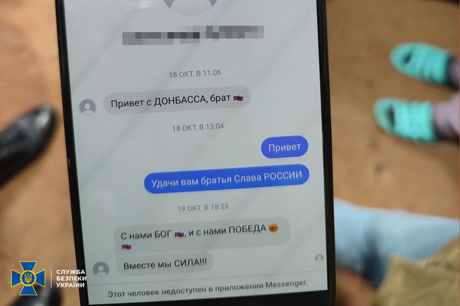Під час обшуку СБУ виявила в телефоні агітатора листування, в якому бажав агресорам удачі, називаючи їх «браттями», а також написав гасло «слава россии».