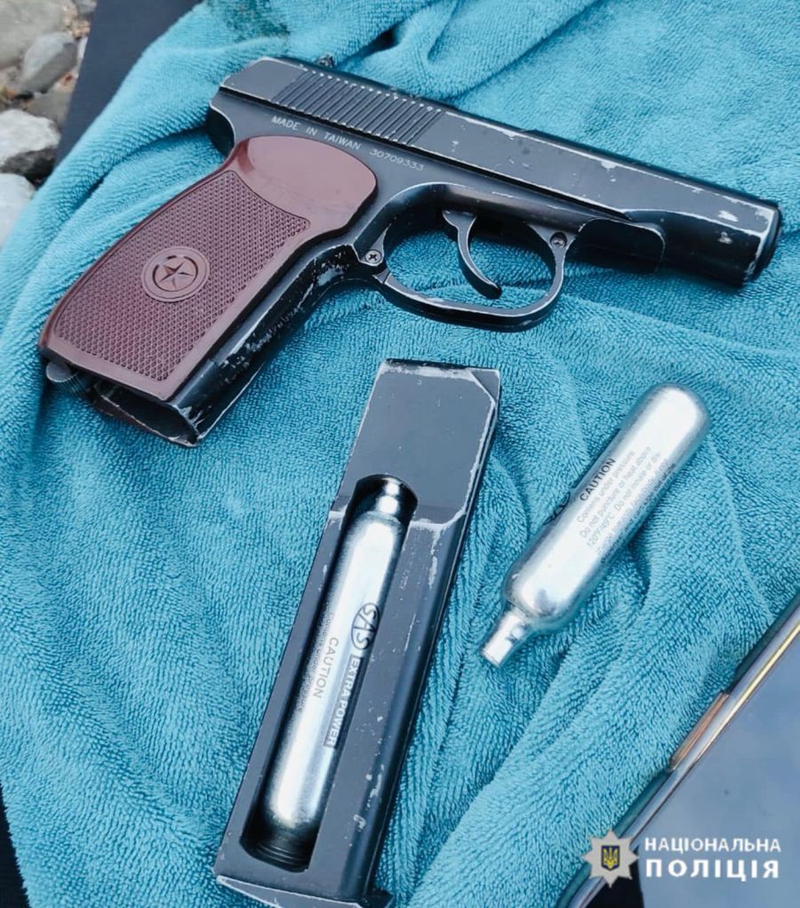 Співробітники вибухотехнічної служби, що також прибули на місце, вилучили предмет, схожий на корпус гранати Ф-1 із запалом. Окрім цього, поліцейські виявили та вилучили молоток, пневматичний пістолет та мобільні телефони. Речові докази направили на експертизу.