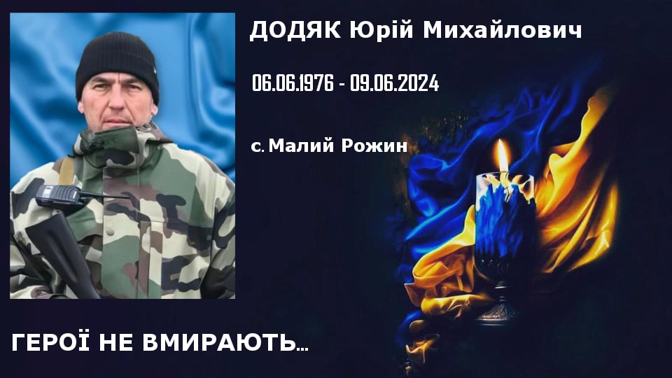 Дев'ятого червня під час виконання бойового завдання загинув Юрій Додяк, житель села Малий Рожин, уродженець Тюдова, якому 6 червня виповнилося 48 років, інформує Кутська селищна рада.