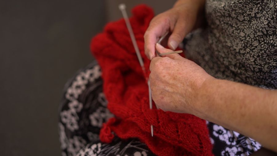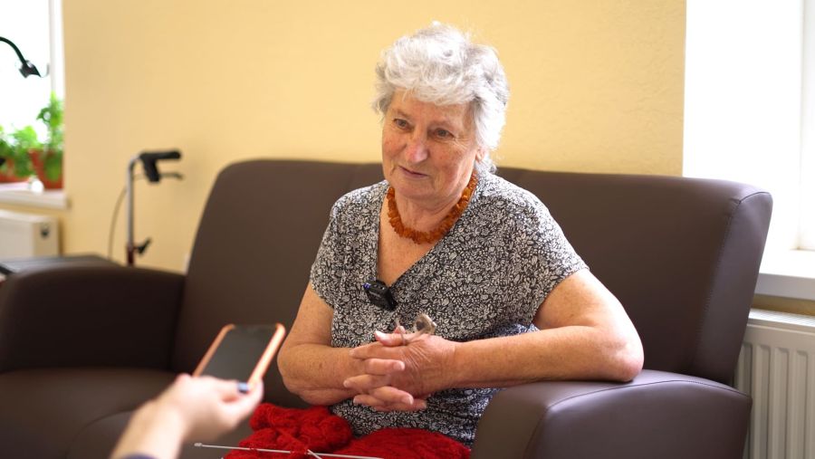 Поліну Гребенюк «Вікна» застали за основним улюбленим заняттям — в’язанням. У руках в жінки одна половина майбутньої червоної кофти. Переселенка розповідає, що до 65 років (а це десять років тому) працювала у медицині. Була фельдшером, акушеркою. Через пів року повномасштабної війни, вона разом зі своєю рідною сестрою, котрій 83 роки, переїхали спочатку в Дніпро, а звідти — у Калуш.