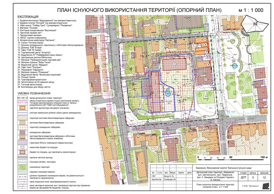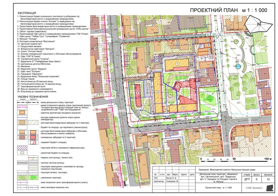 Зазначено, що детальний план території враховує проєктні напрацювання ТзОВ «Зелемінь» під назвою «Новий подих в старий Калуш». Зокрема, приймається оригінальна ідея нового композиційного утворення — СІЛЬ-центр.