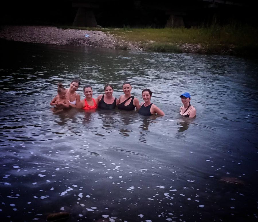 Оксана Дзундза — серед семи фітнесок, які плавали після тренування. Жінка приєдналася до гурту спортсменок через два місяці після відкриття студії. Розповідає, що у фейсбуці таке заняття побачила її мама. Відтоді старається не пропускати, щоразу приїжджаючи з Тужилова.