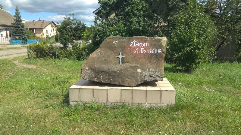 Довідка. Пам’ятник Леоніду Бутеліну розміщений в мікрорайоні Галич — Заріка, на роздоріжжі вулиць сотника Чорноти та Івана Мазепи. Складається з основи (облицьованої плиткою) та самого пам’ятника у формі каменя. На камені з західної сторонни нанесено фарбою напис «Пам'яті Л.Бутеліна» та силует літака (ліворуч від напису). Праворуч від напису висічено дату «1941». Напис фарбою є вторинним, під ним простежується інший, первинний напис (на даний час нечитабельний). В період незалежності України на лицеву сторону пам'ятника прикріплено металевий хрест.