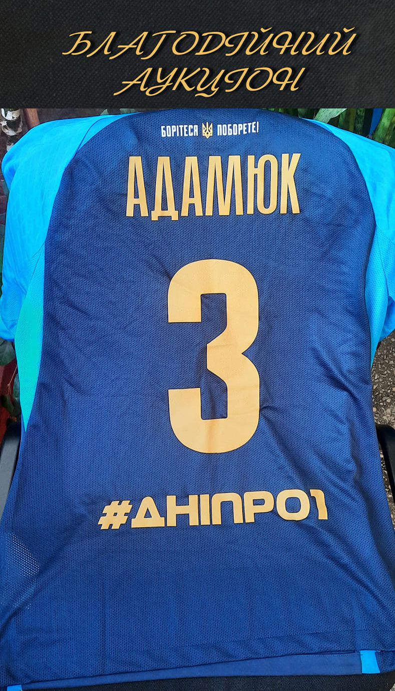 - Футболка №3 СК «Дніпро-1» від Володимира Адамюка. Стартова ціна — 1000 грн.