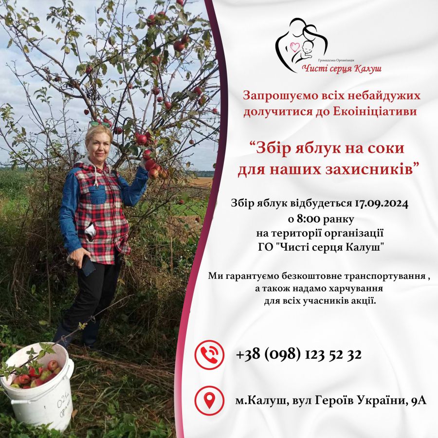 "Зібрані яблука будуть перероблені на натуральні соки, які ми передамо безпосередньо на фронт, щоб наші захисники отримали підтримку та трохи домашнього тепла", — йдеться в повідомленні.