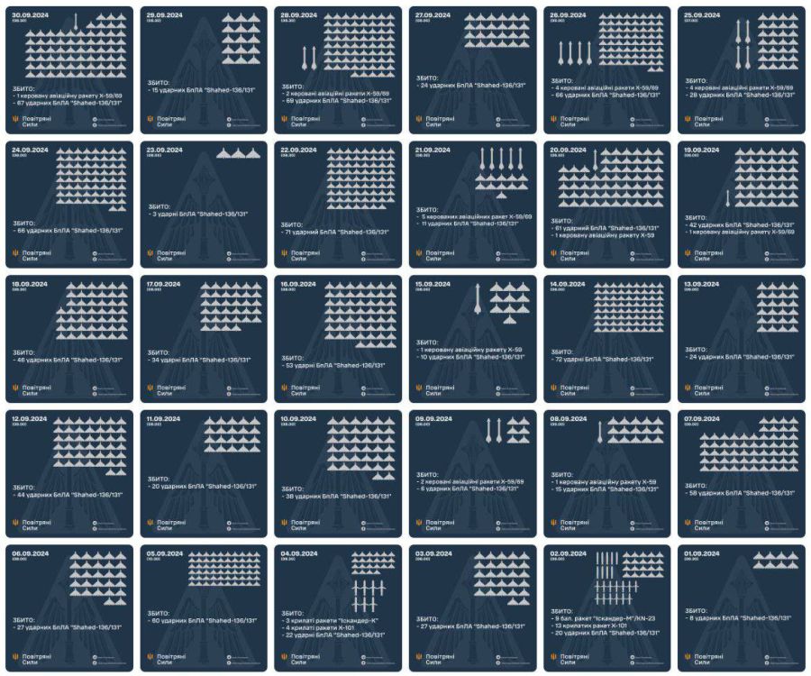 За даними Генерального штабу ЗСУ, минулої доби, 30 вересня, ворог завдав по території України чотирьох ракетних ударів із застосуванням шести ракет, 58 авіаційних ударів (залучивши, зокрема, 98 керованих авіаційних бомб), використав для ураження 635 дронів-камікадзе. Здійснив понад 3400 обстрілів позицій наших військ і населених пунктів.