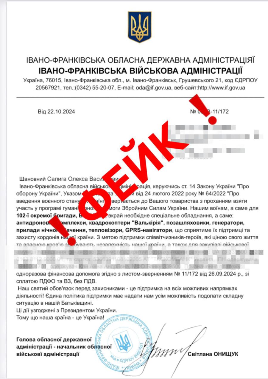 У листах вказано реквізити на ім’я приватної особи, яка жодного стосунку до обласної військової адміністрації не має, зазначила у своєму зверненні у соцмережі начальниця Івано-Франківської ОВА Світлана Онищук.