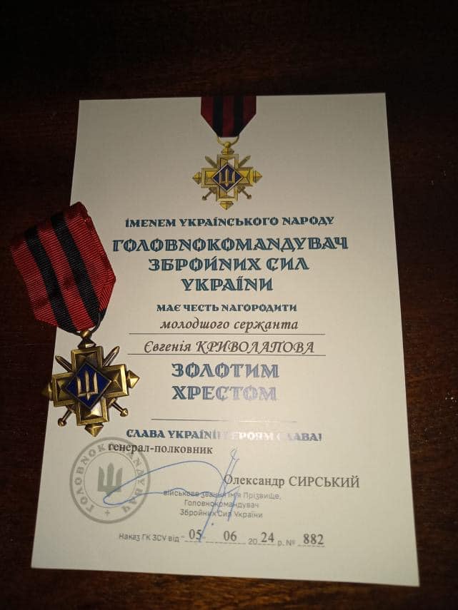 Довідка. Нагрудним знаком "Золотий хрест" нагороджуються особи рядового і сержантського (старшинського) складу Збройних Сил України за проявлену мужність і успішне виконання завдань під час бою.