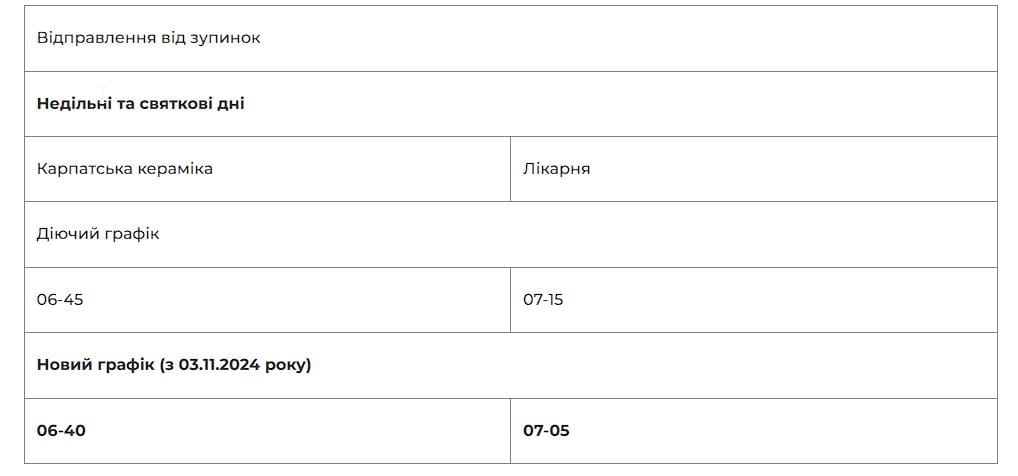 Також, на прохання жителів Калуша, з 3 листопада в недільні та святкові дні буде змінено графік руху автобуса за маршрутом №6А "Карпатська кераміка — Лікарня" по пр. Лесі Українки. Всі інші рейси будуть здійснюватися відповідно до діючого графіка руху.