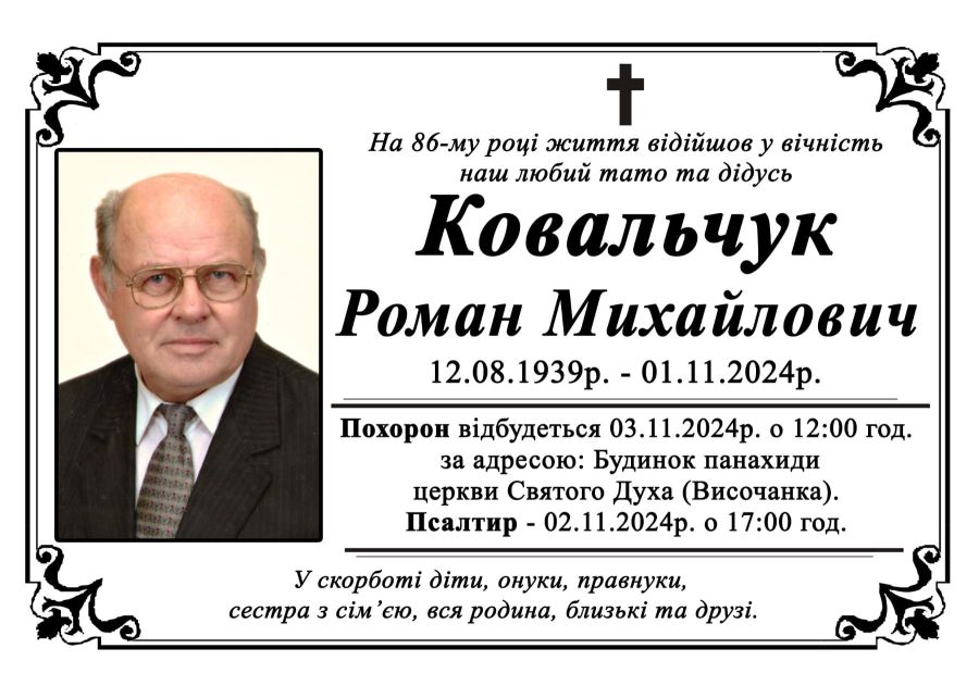 Педагогічний колектив Калуського ліцею №10 повідомив, що на 86 році життя відійшов у засвіти Роман Михайлович Ковальчук, інформують "Вікна".