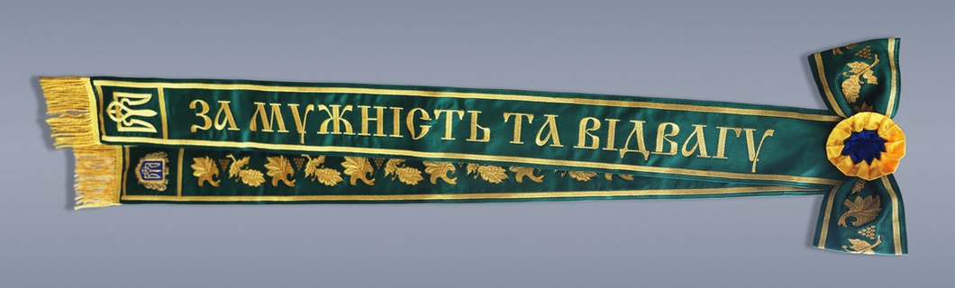 На одному кінці стрічки з обох сторін золотавими літерами вишиті напис «ЗАа мужність та відвагу» і зображення Знака Княжої Держави Володимира Великого. Другий кінець стрічки з обох сторін прикрашений рослинним орнаментом та зображенням медальйона-підвіски Знака Президента України. Кінці стрічки прикрашені золотою бахромою. Розмір стрічки: 250 х 12 см.
