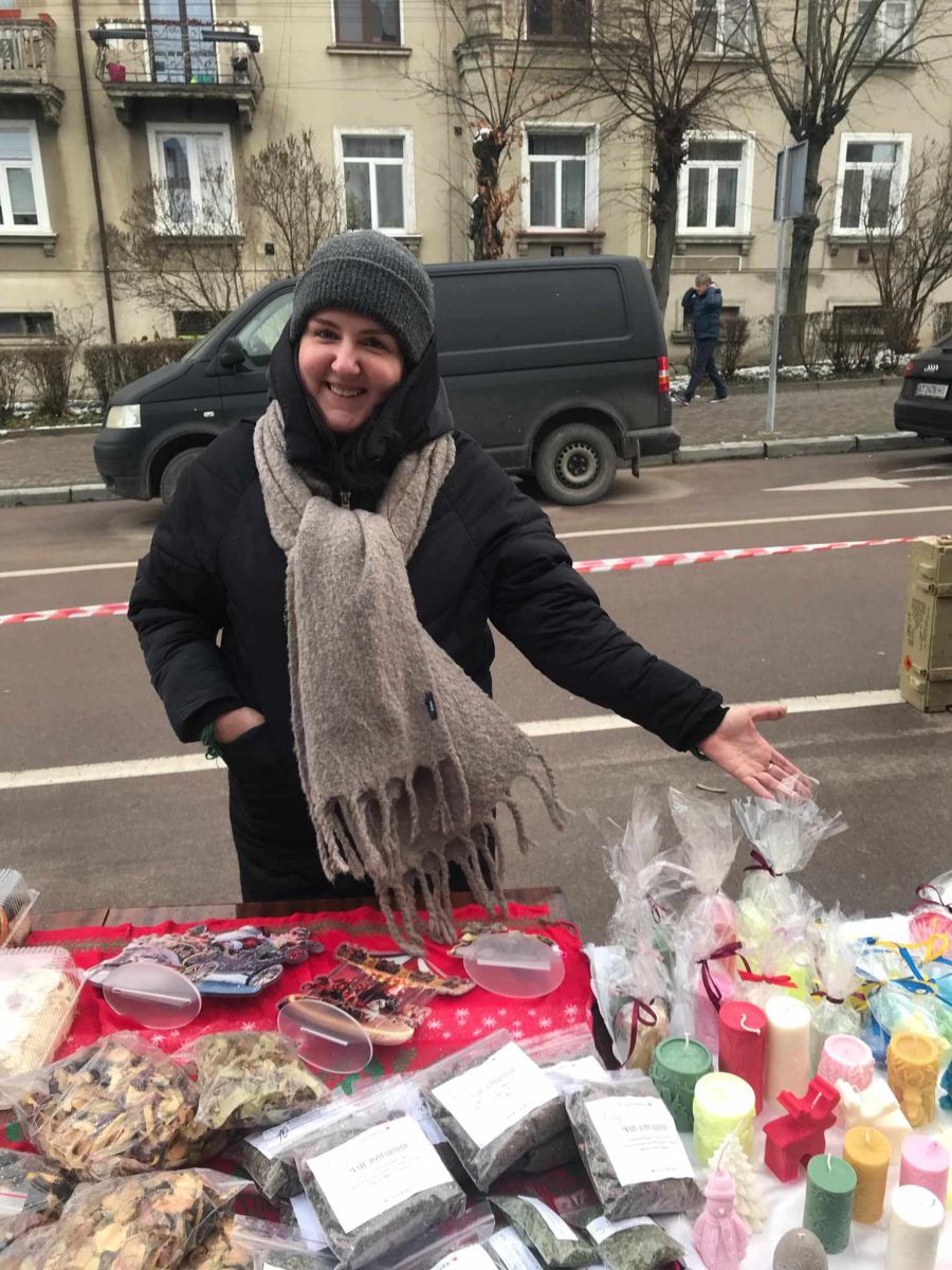 «Основою на цьогорічному ярмарку є наші різдвяні віночки та букети, бо вважаємо, що Різдво має стукати у кожну хату, не зважаючи на війну, тим більше мета — дуже благородна. Для букетів ми спеціально замовляли ялинку нобіліс, яка може простояти до весни та не обсипатися. Представлені букети із сухоцвітів, іграшки ручної роботи, вишиті шпильки та закладки в книжки, які я бачила вперше. Чашки, книги, свічки, які дівчата два тижні тому заливали, випічка, трав’яні чаї, сушка домашня на узвар, приправи. Запам’ятати все нереально. Звісно, що окрема у нас локація — це харчоблок (сміється. — Авт.), адже у таку морозяну погоду гарячі страви дуже актуальні».