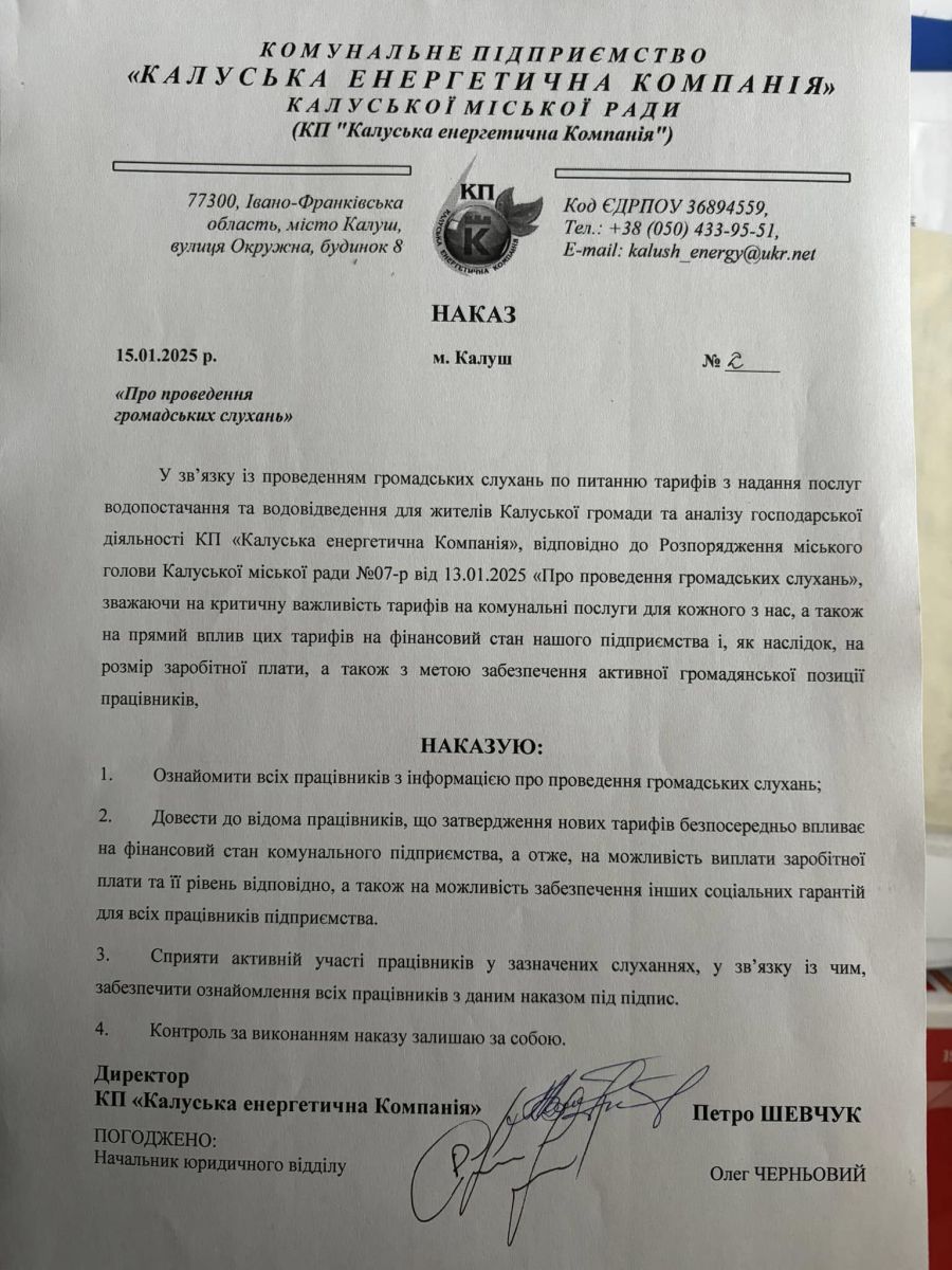 Такі повідомлення підтверджує оприлюднений наказ директора «Калуської енергетичної компанії» Петра Шевчука від 15 січня, у якому «з метою забезпечення активної громадської позиції працівників» наказано ознайомити усіх працівників комунального підприємства з інформацією про проведення громадських слухань (під підпис), «сприяти активній участі працівників у зазначених слуханнях» та довести до відома працівників, що «затвердження нових тарифів безпосередньо впливає на фінансовий стан комунального підприємства, а отже, на можливість виплати заробітної плати та її рівень відповідно».