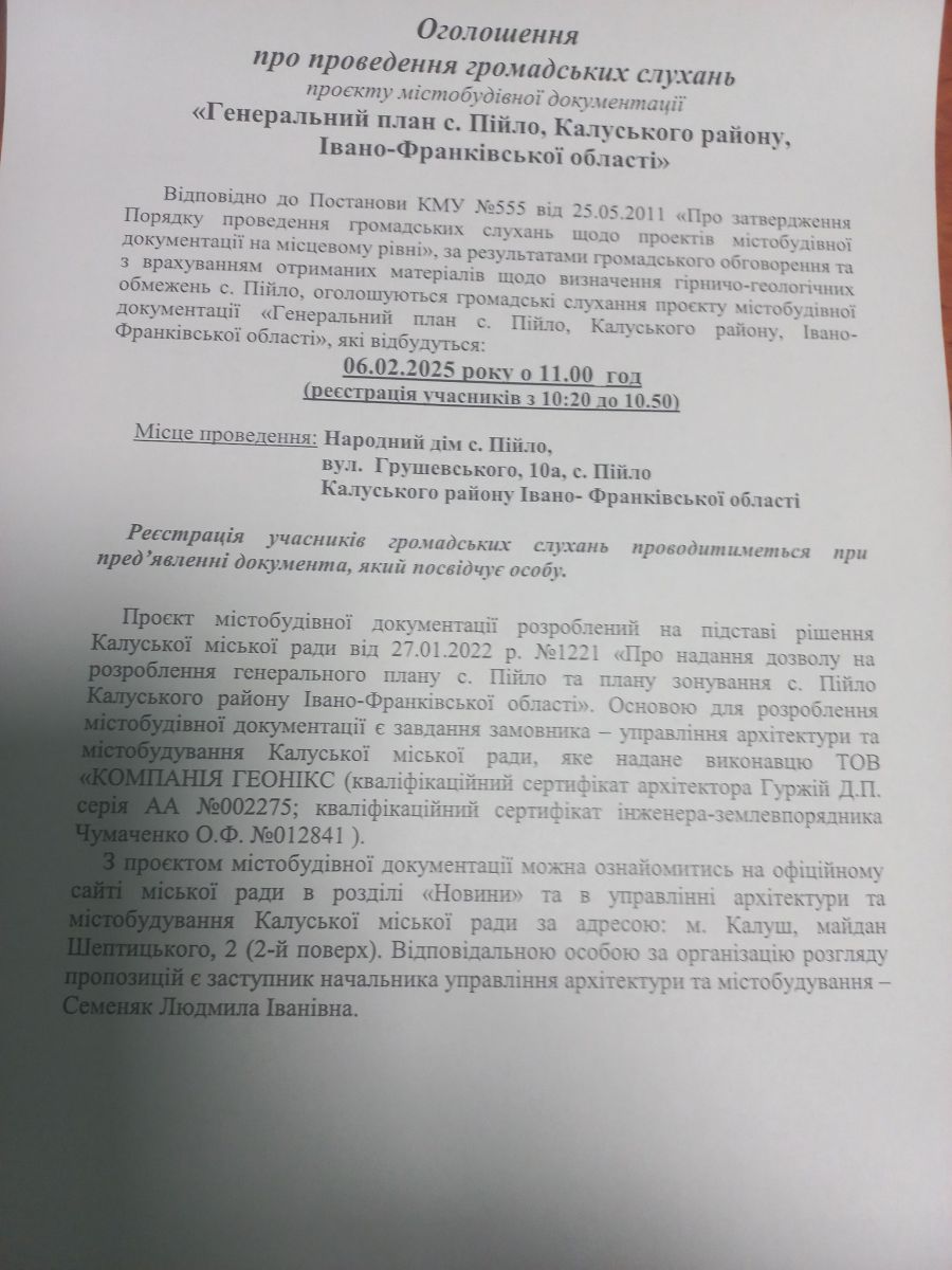 Громадські слухання проєкту містобудівної документації — Генерального плану села Пійло — відбудуться 6 лютого, об 11.00 за адресою: с. Пійло, вул. Грушевського, 10а (Народний дім).