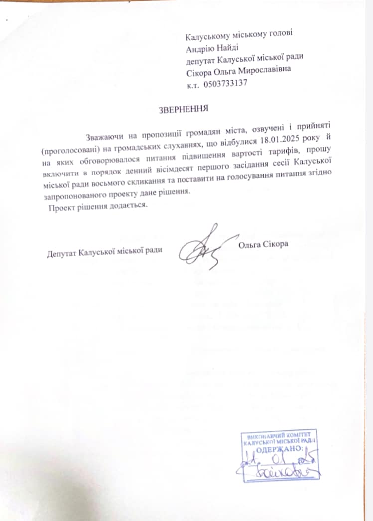 21 січня депутатка Калуської міської ради Ольга Сікора зареєструвала проєкт рішення Калуської міської ради «Про скасування рішення виконавчого комітету Калуської міської ради від 16.12.2024 року №321 «Про встановлення тарифів на послуги з централізованого водопостачання та централізованого водовідведення комунальному підприємству «Калуська енергетична компанія» на 2025 рік».