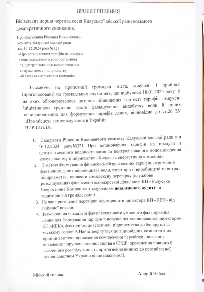 Проєктом рішення на основі пропозицій громадських слухань від 18 січня пропонують скасувати тарифне рішення виконкому. А також для формування обґрунтованих тарифів, отримання фактичних даних виробництва води, її втрат при виробництві та витрат підприємства провести комплексну перевірку (службове розслідування) фінансово-господарської діяльності КП «Калуська енергетична компанія» з залученням незалежного аудиту та аудиторів від громадськості. Також ідеться про те, щоб на час проведення перевірки відсторонити директора комунального підприємства Петра Шевчука від займаної посади. У проєкті рішення є доручення міському голові Андрію Найді звернутися до відповідних компетентних органів з метою проведення повного й всебічного розслідування та притягнення винних до відповідальності.
